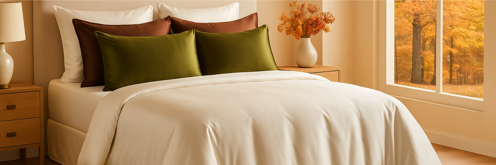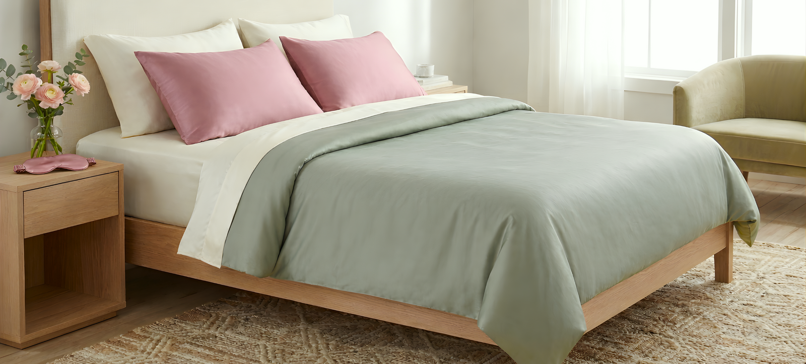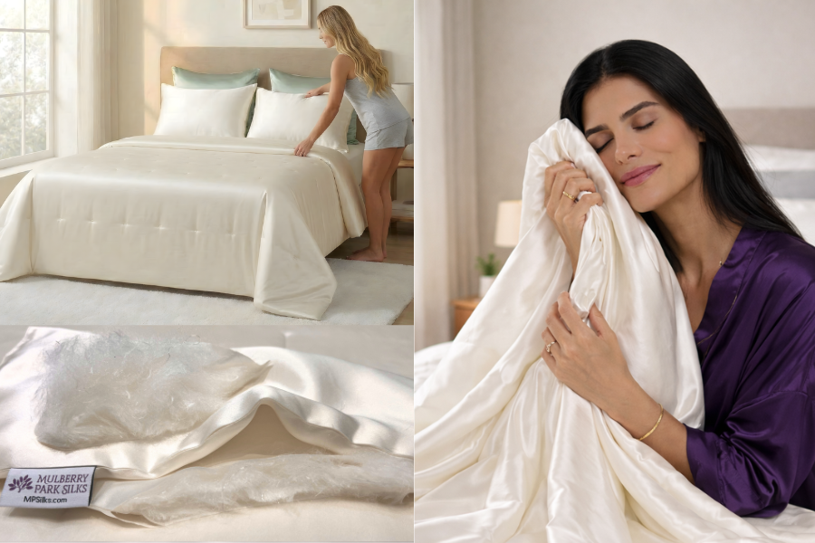 Our bedding is crafted from 100% pure Mulberry silk, the highest quality silk available. It is naturally hypoallergenic, gentle on hair and skin, and helps prevent sleep wrinkles, tangles, and bedhead. Mulberry silk also regulates temperature, keeping you cool in summer and warm in winter, ensuring a comfortable sleep experience year-round.