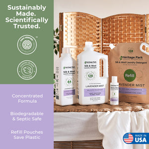 Use Heritage Park Silk & Wool detergents to wash silk, wool, cashmere, alpaca, washable furs, and other protein-based fabrics. Perfect for clothing, lingerie, bedding, and other home textiles.